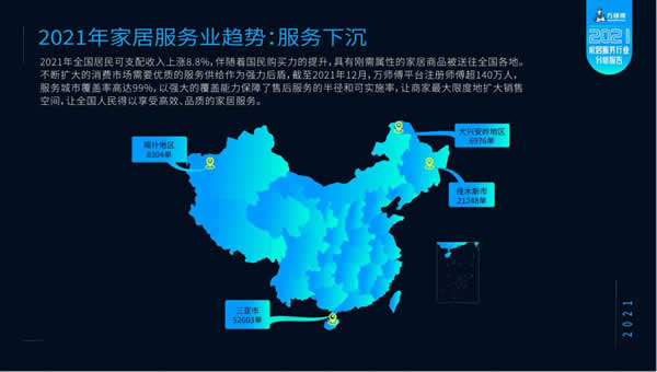 伴隨著居民可支配收入提升和市場(chǎng)下沉,家居商品通過互聯(lián)網(wǎng)流向全國(guó)各地。相對(duì)應(yīng)地,家居服務(wù)市場(chǎng)活力持續(xù)釋放,服務(wù)需求以一線及新一線城市為中心向全國(guó)各地輻射,服務(wù)訂單較上年成倍增長(zhǎng)。