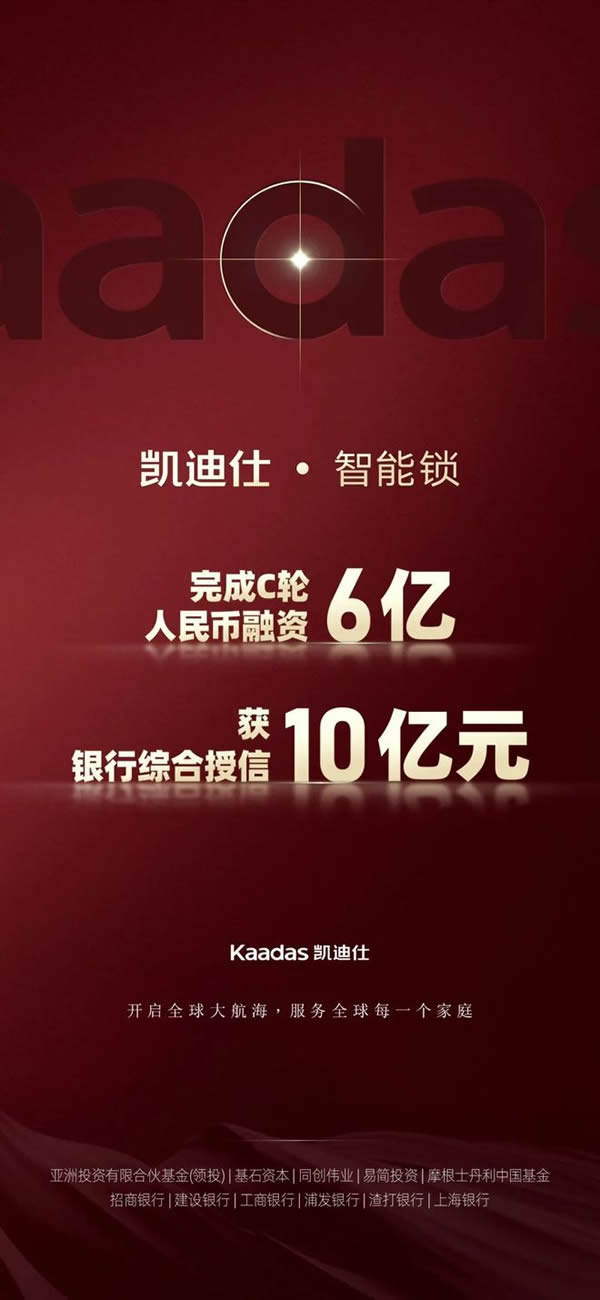 智能門鎖品牌“Kaadas凱迪仕”已于近期完成6億元人民幣的C輪融資,再獲招商銀行、建設銀行、工商銀行、浦發銀行,渣打銀行、上海銀行六大銀行10億元綜合授信。