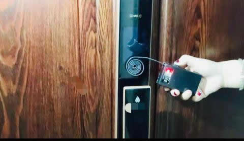 視頻顯示,這個“小黑盒”比手機小一點,但要厚一倍,黑盒上有兩個按鈕,一個是底部的電源鍵,另外一面是觸發開關。女子將小黑盒對著一個智能鎖,將黑盒的銅線圈貼近智能鎖,在鎖體不同的位置游走;同時一下一下按下小黑盒上的觸發鍵,隨著鎖體里電機轉動聲,原本設置指紋和密碼的智能鎖一下就被打開了。