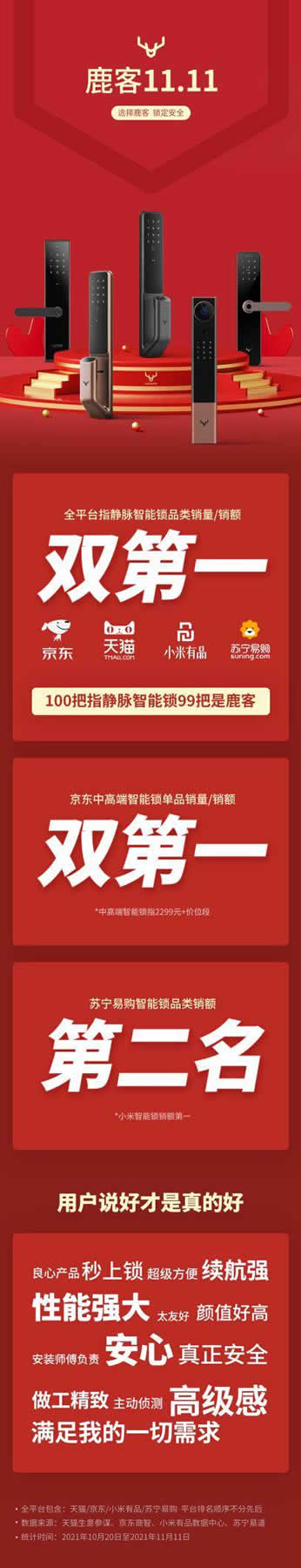 多渠道開花,品牌于蘇寧渠道也戰績不凡,截止2021年11月11日,品牌在蘇寧易購達成了智能鎖品類銷額第二的好成績,第一為小米智能鎖,傲人的業績不僅印證了鹿客的口碑,更是給了品牌和市場一劑強心針。