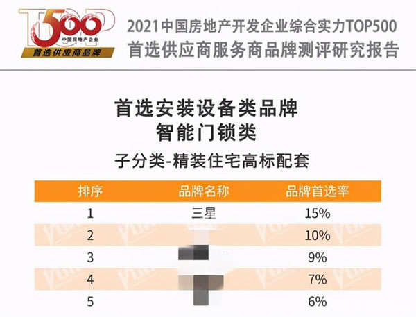 根據評測報告,三星SDS株式會社以15%的品牌首選率,蟬聯2021中國房地產開發企業綜合實力TOP500智能門鎖類精裝住宅高標配套供應商品牌首選率第一名。