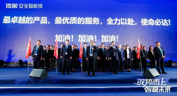 頂固集創家居董事長林新達先生等公司領導、董事會代表以及來自全國各地的經銷商家人齊聚一堂,共同開啟頂固安全智能鎖2021年新征程!