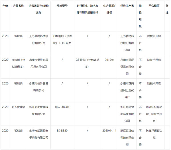 其中,抽查了15批次電子防盜鎖(電子鎖)產品,有5批次產品不合格,不合格發現率為33.33%。不合格項目涉及防破壞報警功能、防技術開啟。