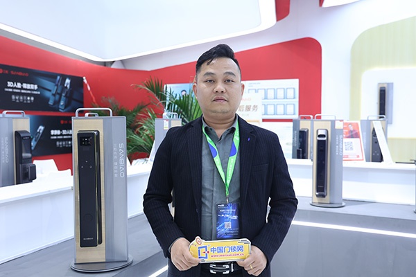 三彪名派智能鎖黃總:本次展會現場帶了一個我們的新品,它也是目前我們行業比較高端的一款,前后的雙攝像頭,我們的鋰電池也是配備雙電池的設計,整體外觀的造型也是比較時尚,符合現代人的需求。